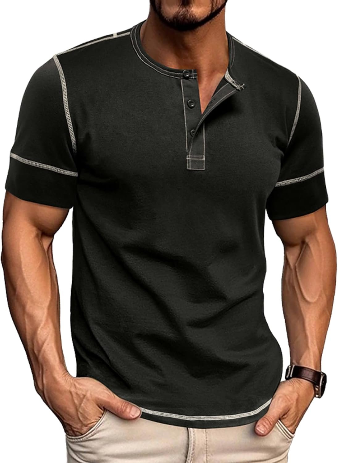 Mens Henley Shirts Casual Stretch Solid Color Short Sleeve T…