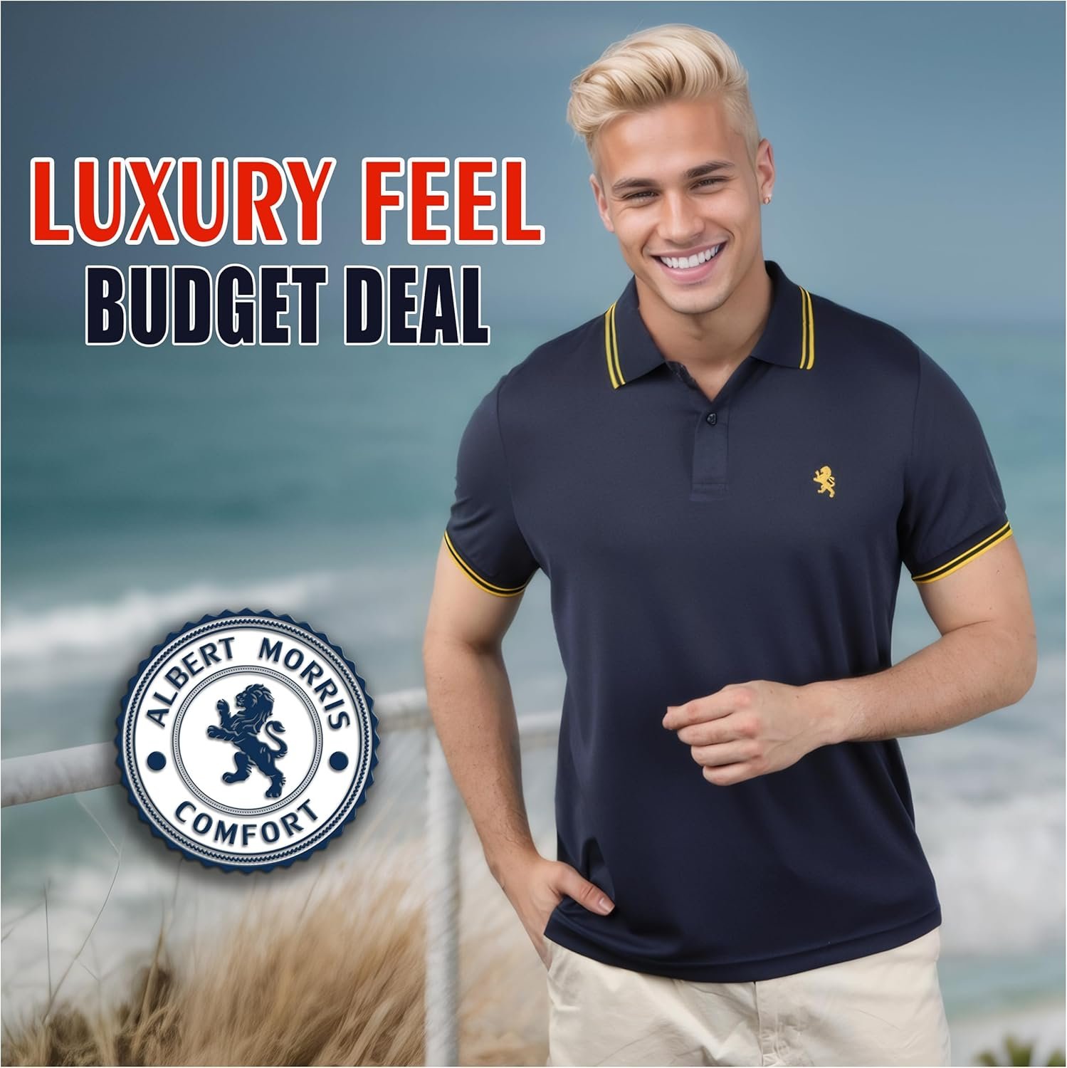 Write an article in French about: Albert Morris Mens Striped Short Sleeve Polo Shirts 4 Pack In English