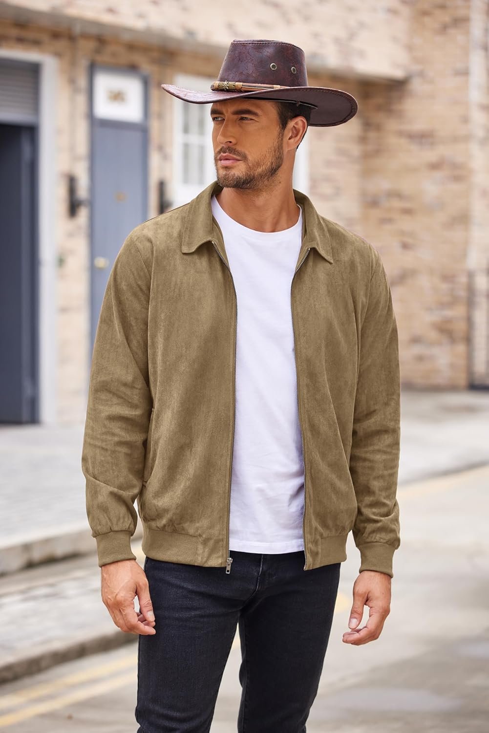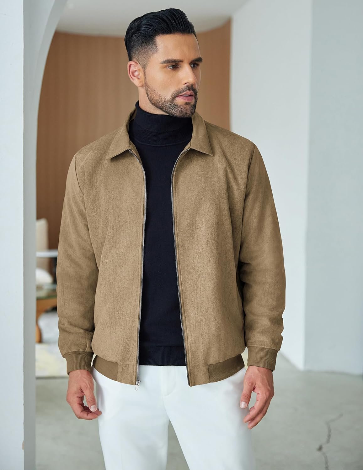 Write an article in French about: COOFANDY Men’s Casual Suede Bomber Jacket Lightweight Full Z… In English