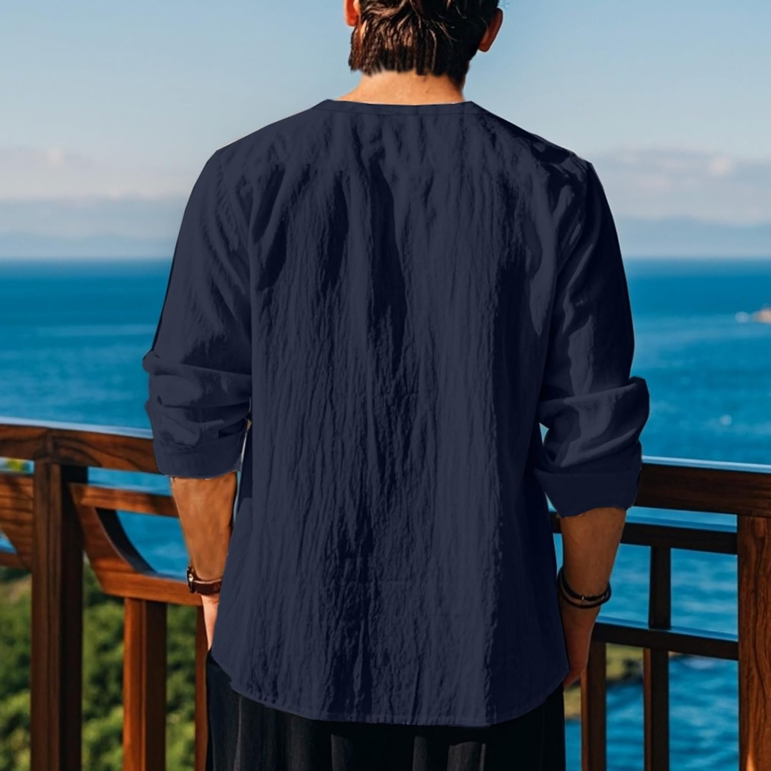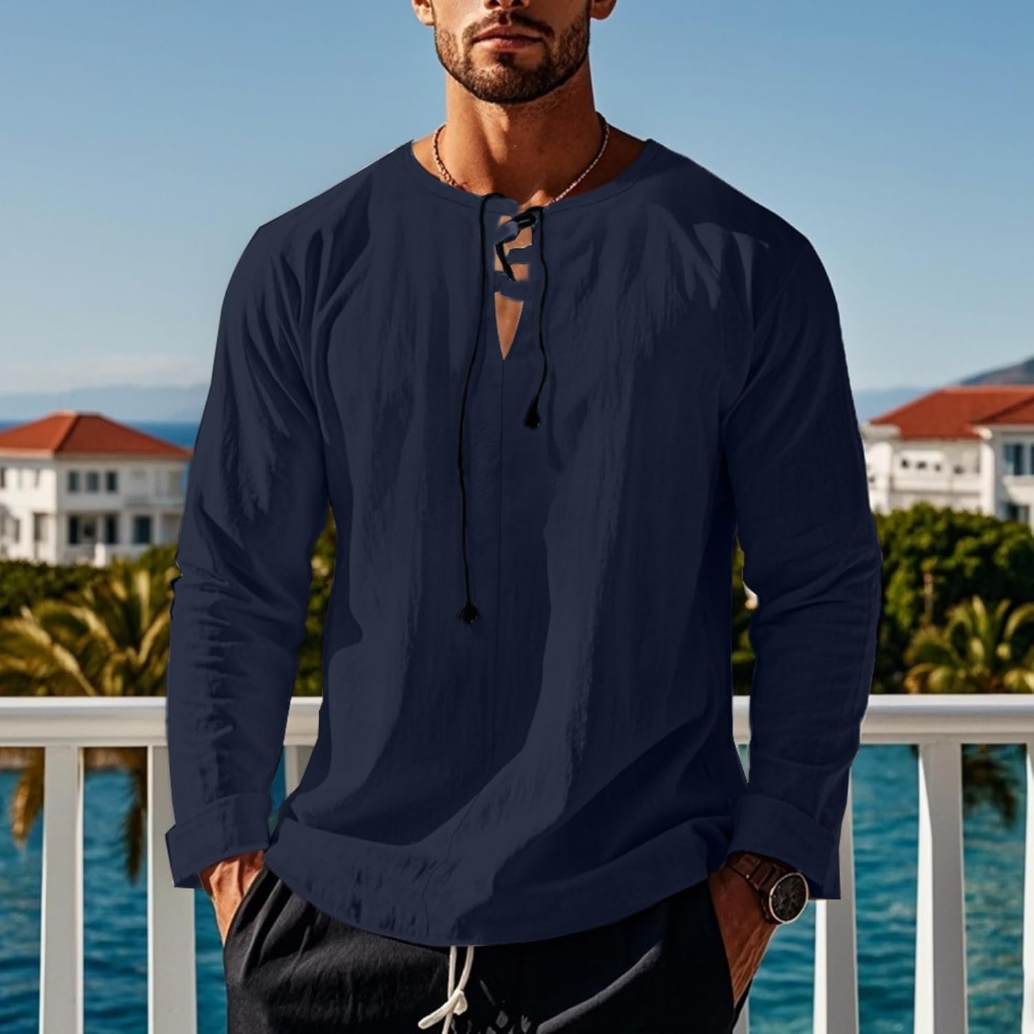Write an article in French about: Cotton Linen Shirts Men V Neck Lace Up Long Sleeve Solid Col… In English