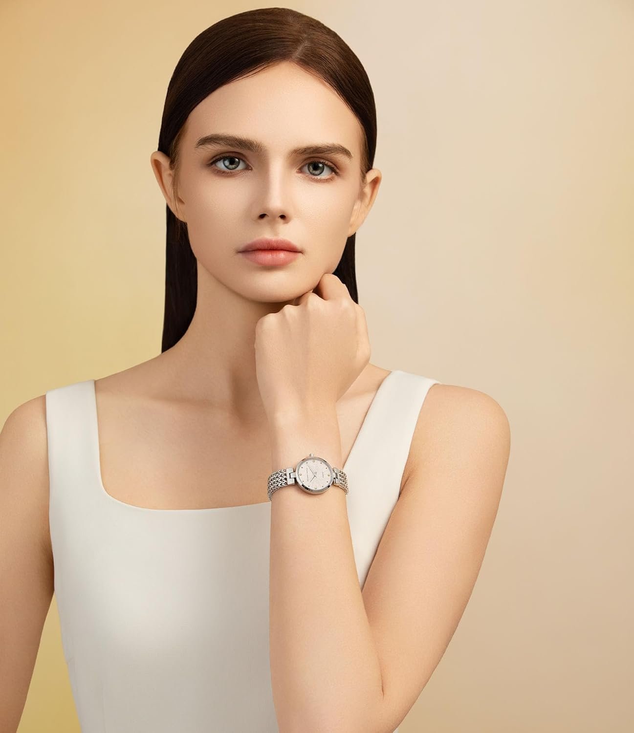 Write an article in French about: Dainty Gold Watch for Women: Mother of Pearl Dial with Diamo… In English