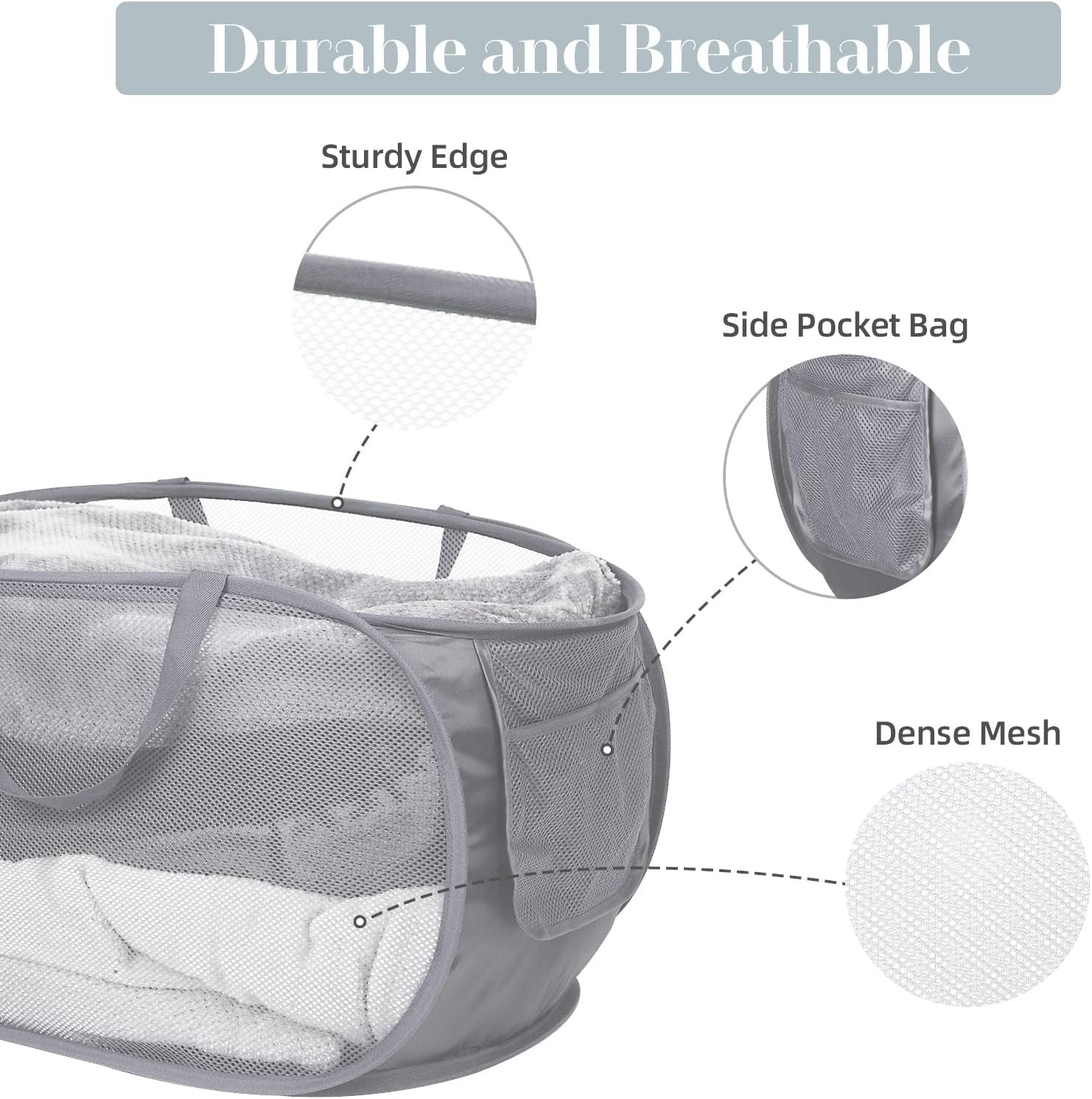 Durable Collapsible Laundry Baskets, Mesh Pop Up Laundry Hamper with Side Pocket, Foldable Clothes Storage Hamper with Reinforced Carry Handles for Laundry, Bathroom, Kids Room, Dorm or Travel Grey