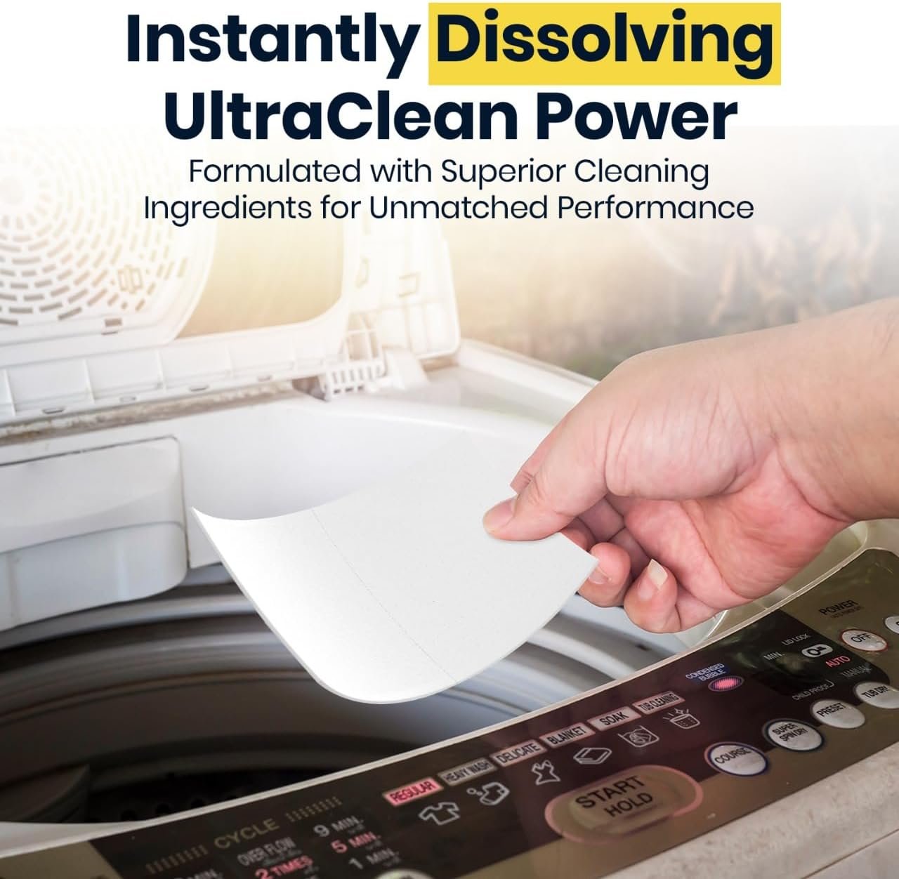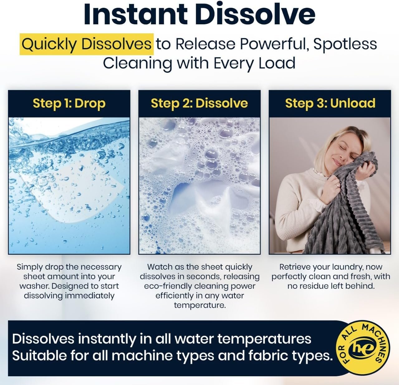 【QUICK DISSOLVE & MESS-FREE】Engineered for convenience, our detergent sheets dissolve instantly in water, eliminating clumps and preventing spills. This fast-dissolve technology minimizes pre-soak time and ensures an even distribution of cleaning agents, saving you valuable time and hassle during every wash cycle.