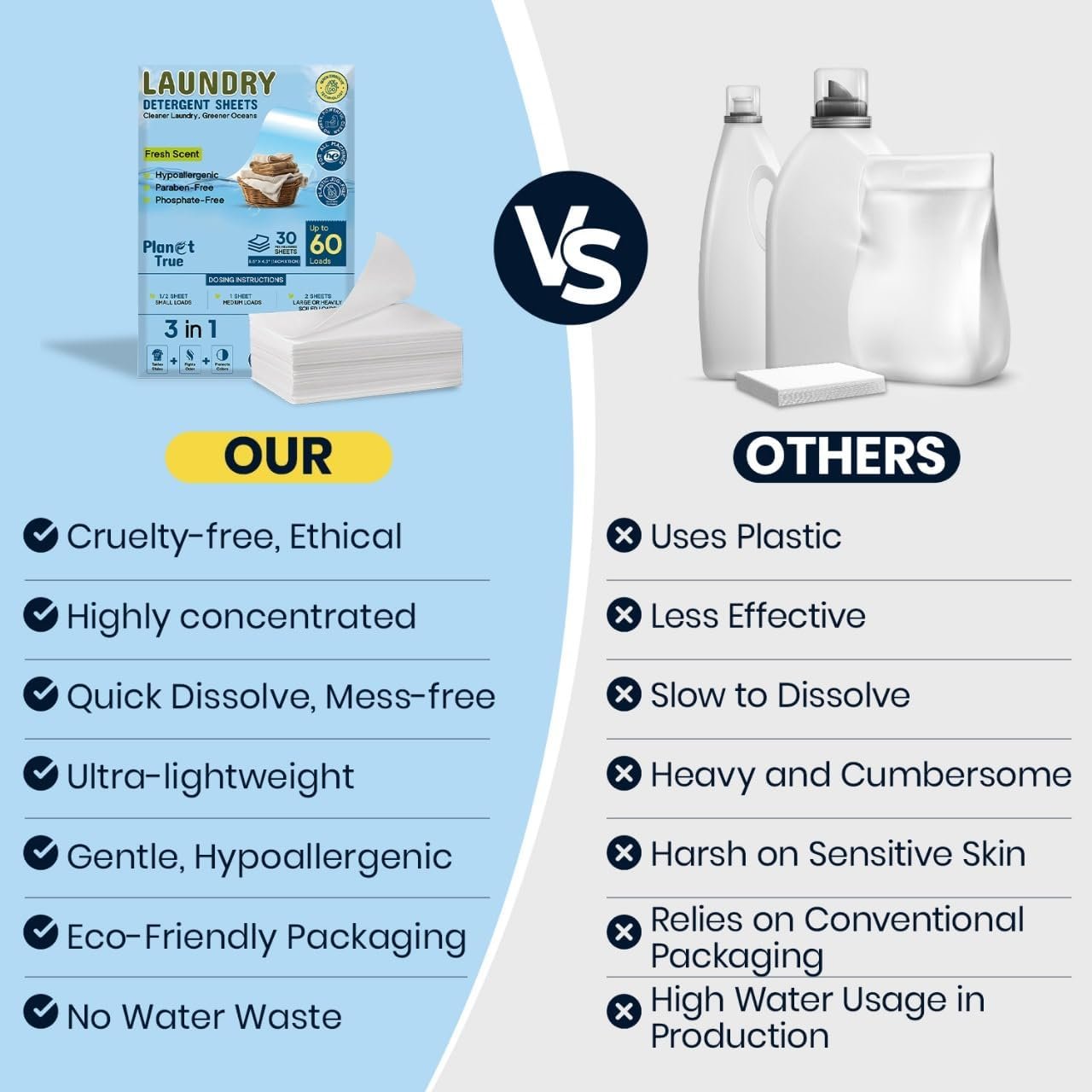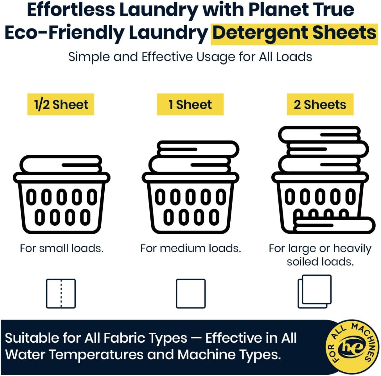 【ULTRA-CONCENTRATED FORMULA】Planet True advanced detergent sheets boast an ultra-concentrated formula enriched with natural cleaning enzymes that effortlessly break down stubborn stains and grease. They dissolve rapidly in any water temperature—hot, warm, or cold—delivering a powerful, residue-free clean in both high-efficiency and conventional washers.