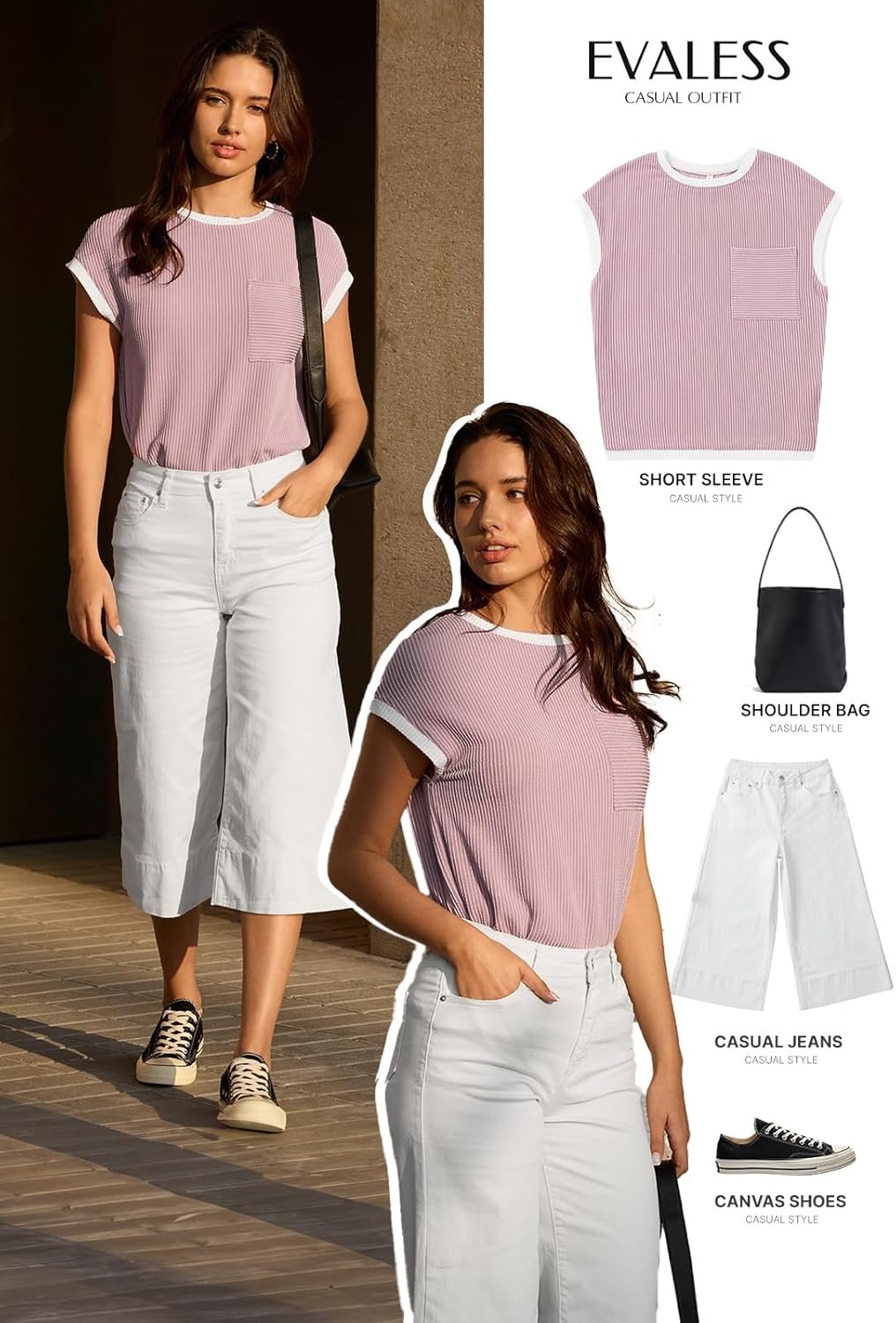 Write an article in French about: EVALESS Women’s Short Sleeve T Shirts Crewneck Color Block R… In English