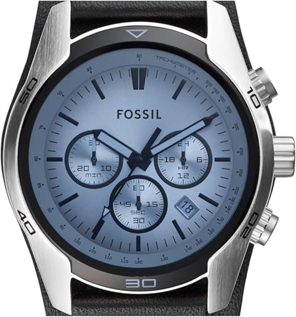Write an article in French about: Fossil Men’s Coachman Quartz Stainless Steel and Leather Chr… In English