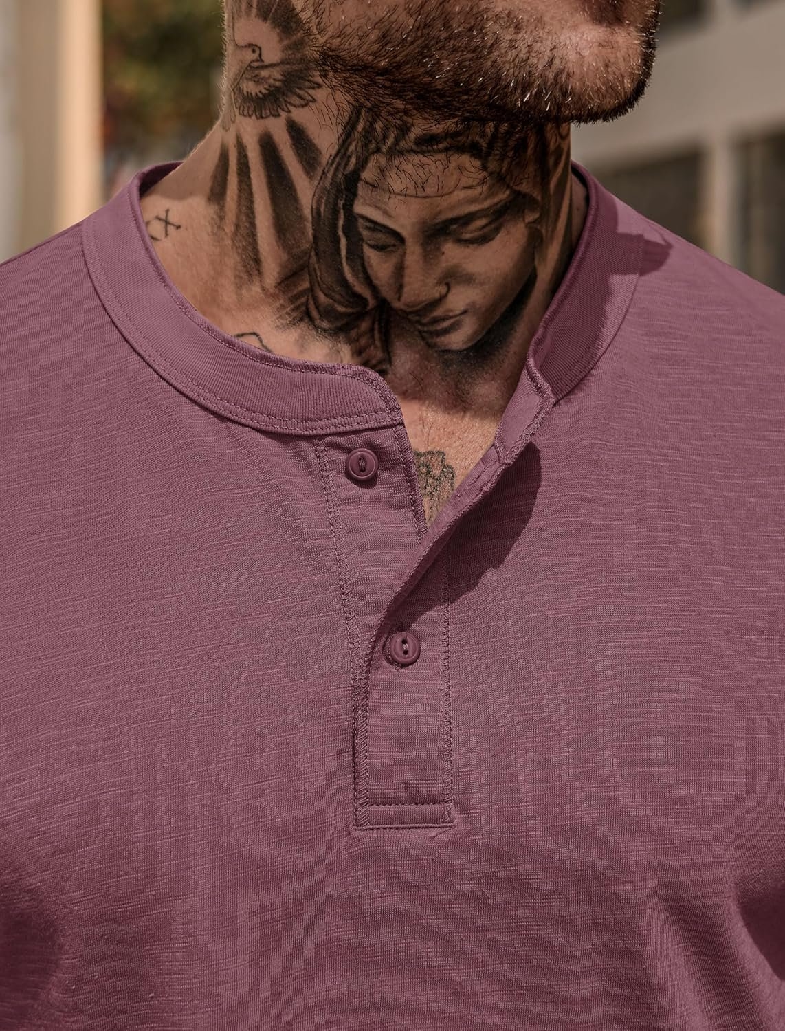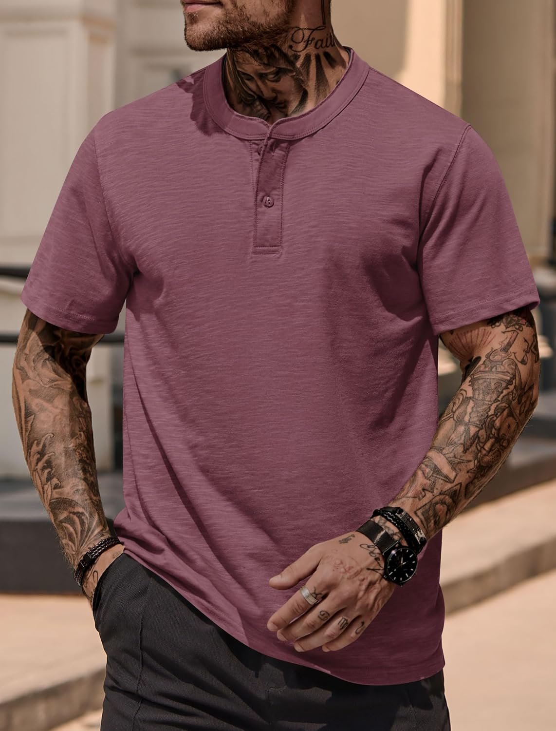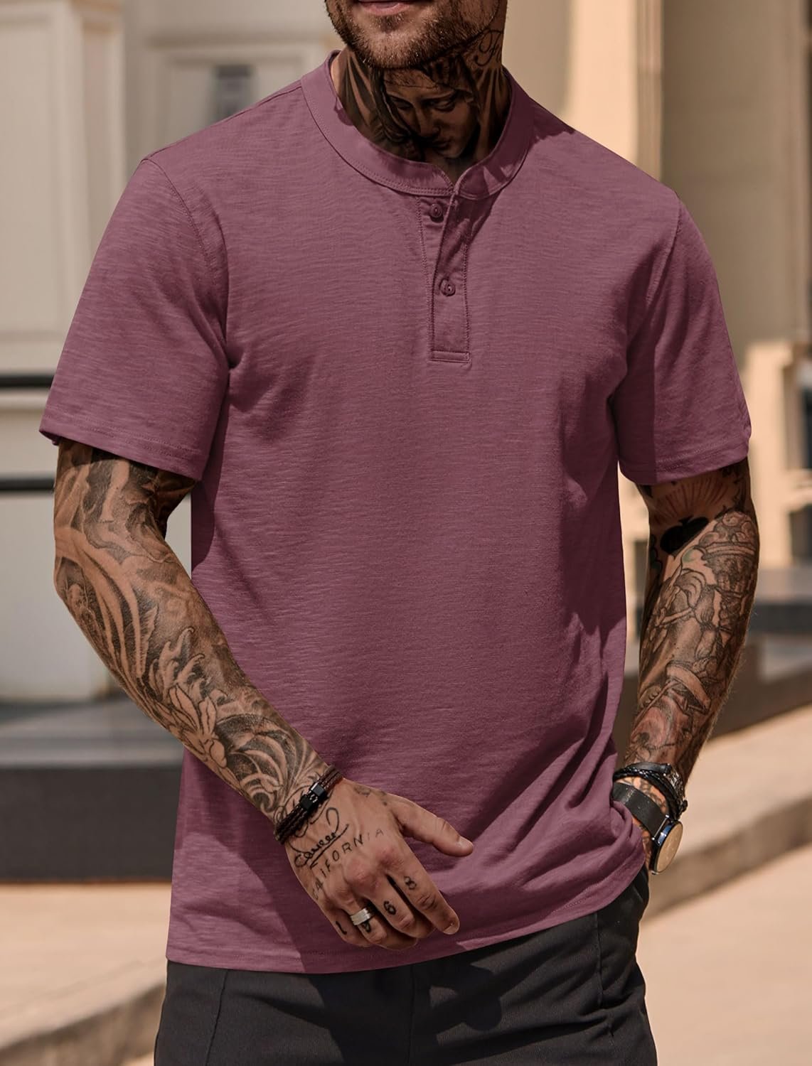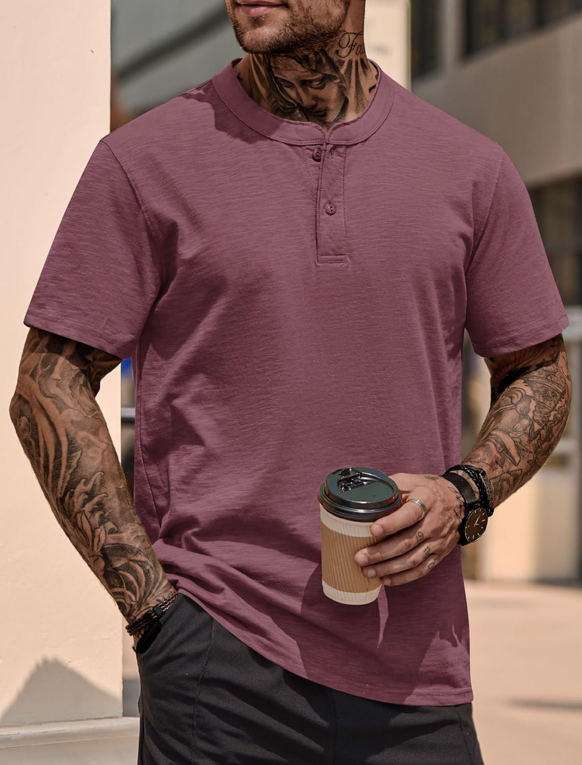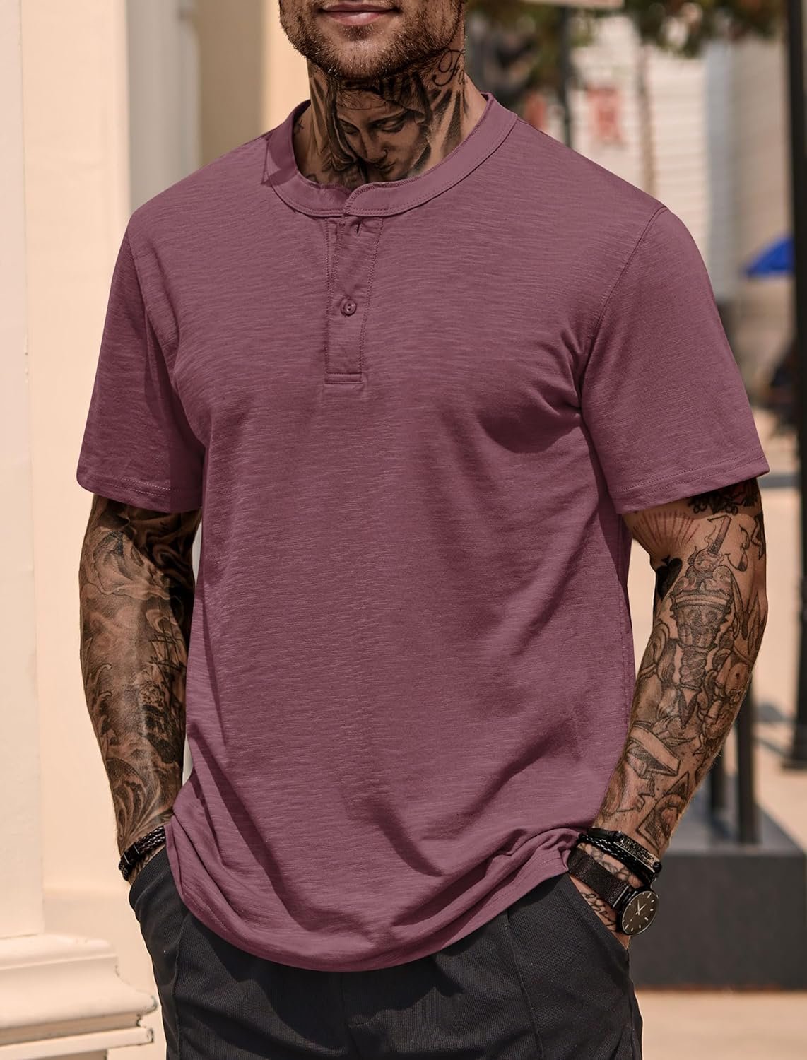 Write an article in French about: Mens Henley Shirts Casual Stretch Solid Color Short Sleeve T… In English