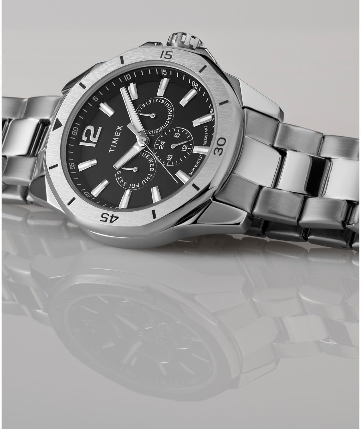 Write an article in French about: Timex Men’s Essex Avenue Day-Date 44mm Quartz Watch In English