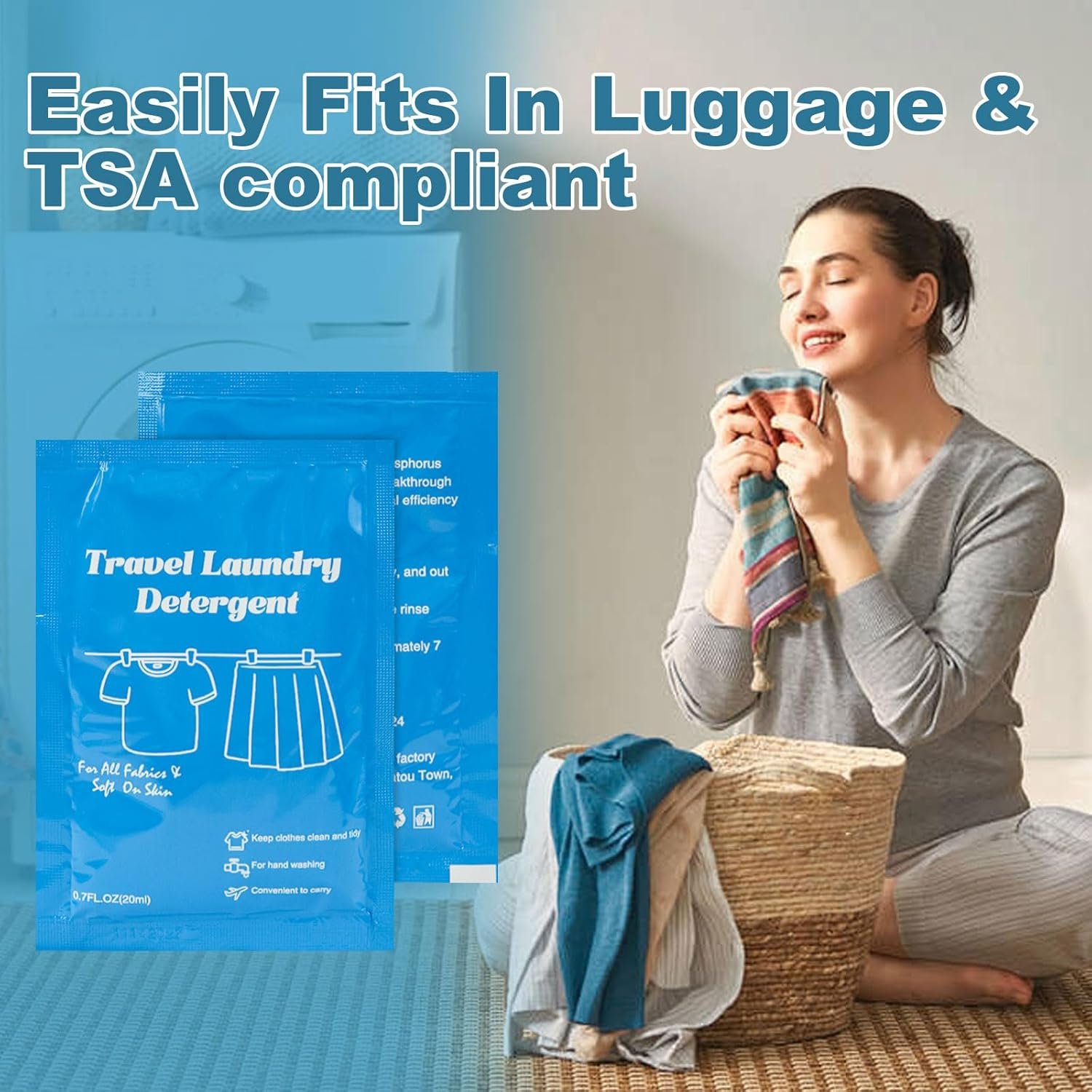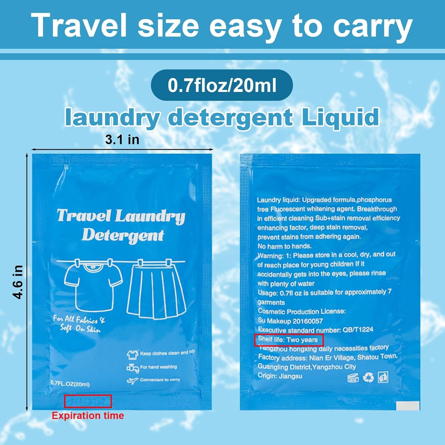 1.Travel Size Packets: you will get 50 pack of travel size detergent laundry, capacity per pack: 0.7floz/20ml , which meets airport regulations. It can be carried with you in your backpack or checked in luggage whether it’s business trips, trips, or outdoor activities. No need to worry about liquid leakage or occupying too much space.