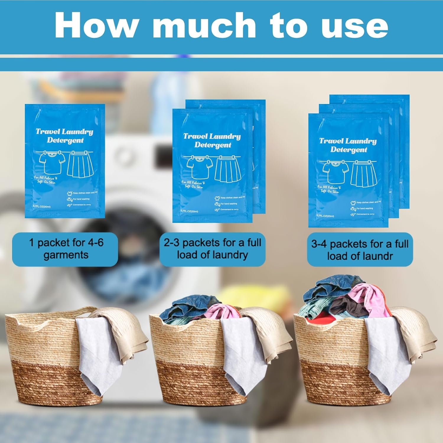 4.Reasonable dose control : travel washing detergent adopting Packets design, Use1 packet for 4-5 garments and 5-8 packets for a full load of laundry .You can choose to use an appropriate amount of based on the number of clothes and the degree of stains.