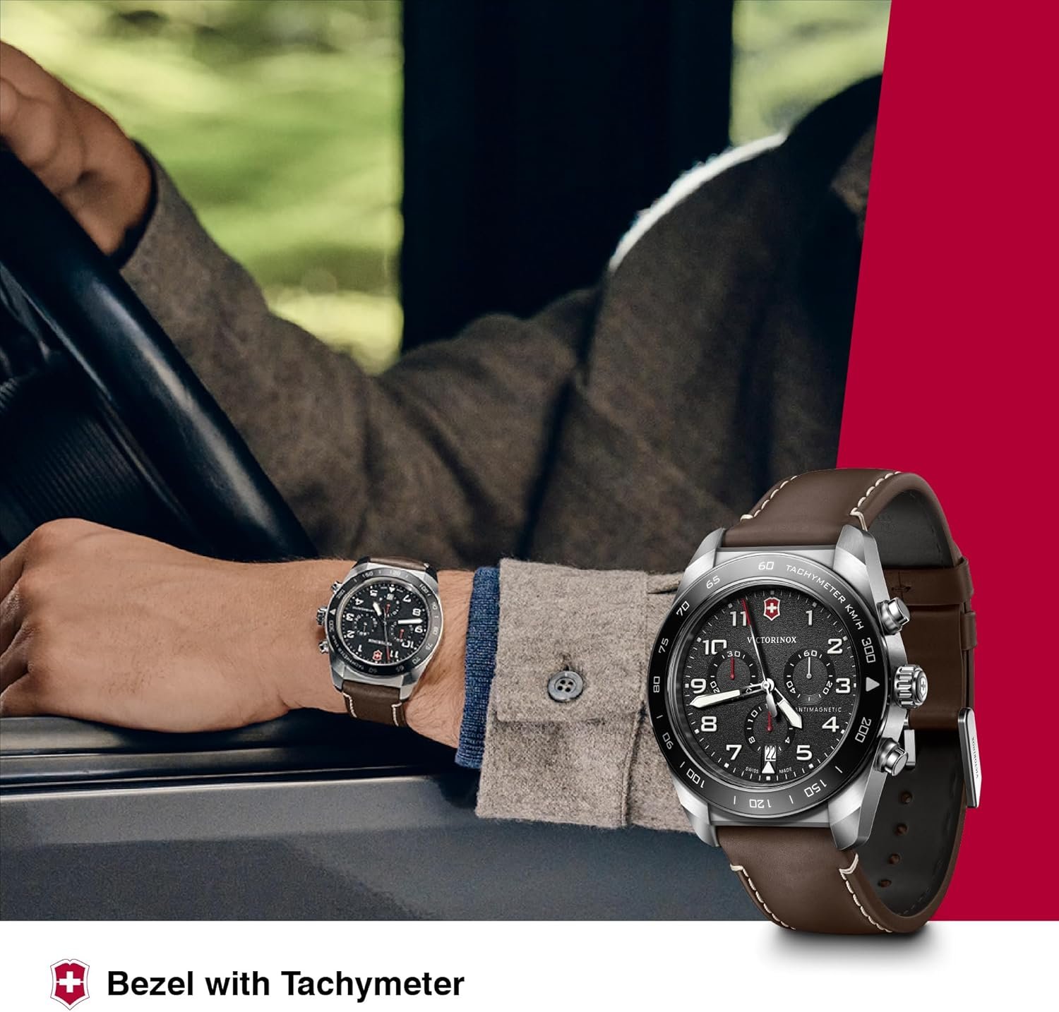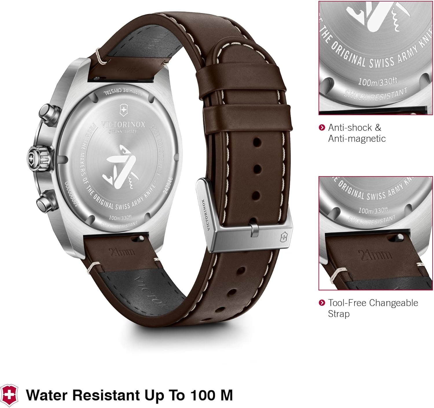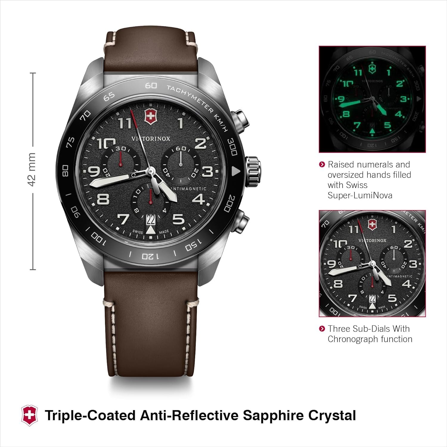 Write an article in French about: Victorinox Swiss Army Chronograph Black Dial Brown Leather S… In English