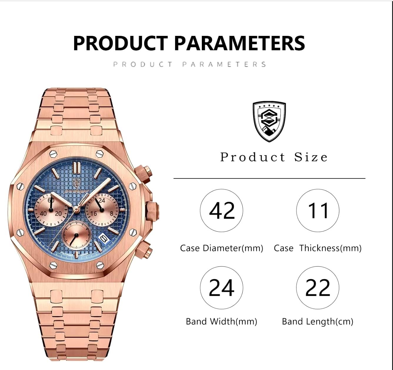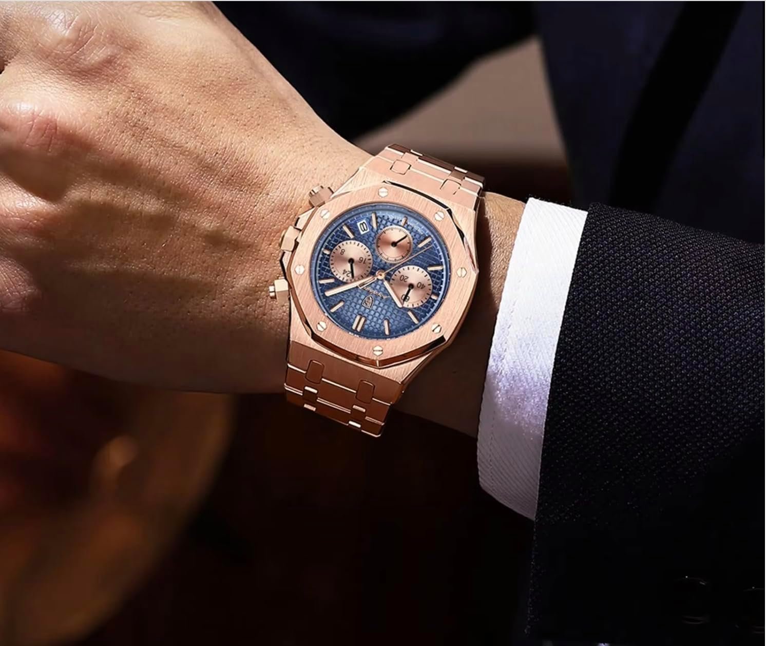 Write an article in French about: Watches for Men Titan Steel Chronograph – Bold Rose Gold Men… In English