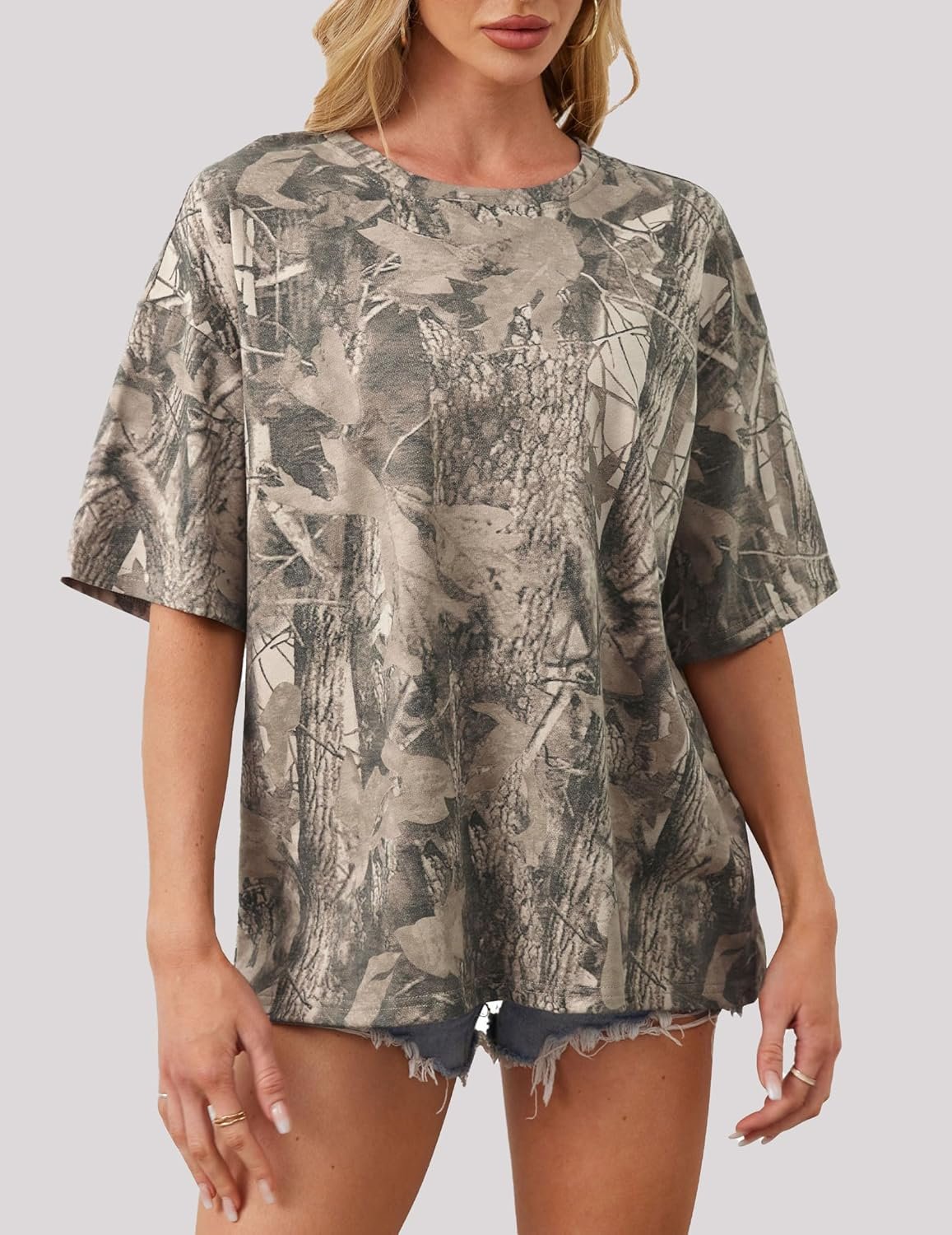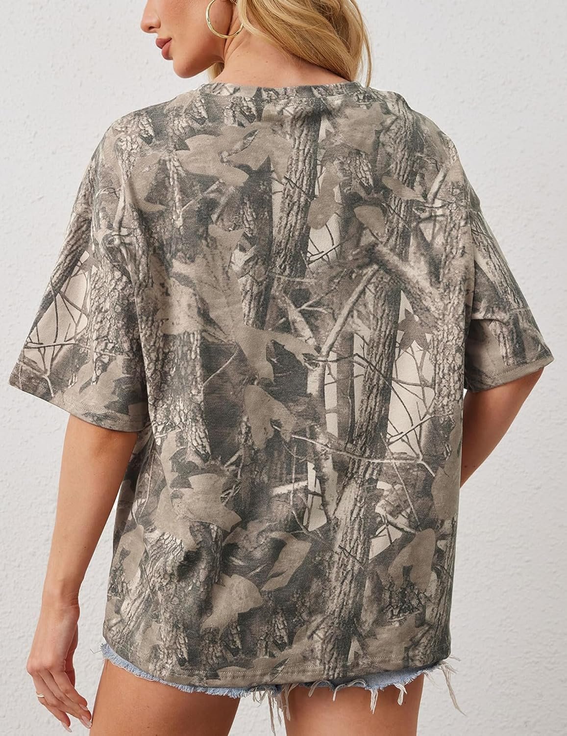 Customers find the camo shirt’s color flattering, with one mentioning it can be dressed up or down for different occasions. The material is comfortable and soft, and customers appreciate the cute oversized fit. They also consider it good value for the price.